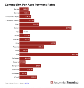 “The highest per-acre payments will be paid to rice farmers, who could receive $132.89 an acre; cotton farmers, at $117.35 an acre; and oat farmers, at $81.75 an acre,” Huffstutter and Ingwersen reported. “Meanwhile, farmers are eligible for a payment of $44.36 per corn acre, $30.88 per soybean acre and $39.35 per wheat acre. The payments are calculated using 2025 planted acres, cost-of-production data, and market conditions, USDA said.”