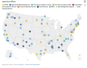 “Agencies affected include Farm Service Agency (FSA) and Natural Resources Conservation Services (NRCS) and their locations across 39 states and four territories,” Squire reported. Also included are offices for the Animal & Plant Health Inspection Service, Agricultural Marketing Service, Food Safety and Inspection Service, Food and Nutrition Service, Forest Service, the Risk Management Agency and the Rural Housing Service.