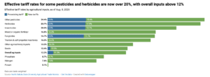 “The average effective tariff rate across all inputs jumped from just 0.9% when Trump took office in January to 12.2% today. But some widely-used farm inputs, including pesticides, have seen steeper tariff hikes,” Ward reported. “The average effective tariff rate applied to herbicides, insecticides and other pesticides is now 20% or higher. Tractors and other ag machinery and parts saw average effective tariff rates hiked from zero — or close to — to 16% and 13%, respectively. Phosphate and nitrogen enjoyed tariff-free trade before Trump took office but are now subject to average effective rates near 10%.”
