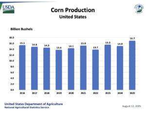 “USDA increased the 2025-26 corn production by more than 1 billion bushels (bb) in the report, moving from 15.705 billion bushels to 16.742 bb. For comparison, record production was 15.34 bb in the 2023-24 crop,” Progressive Farmer reported. “Planted acres for corn were also increased 2.1 million acres (ma) to 97.3 ma. Harvested acres are projected at 88.7 ma, up from 86.8 ma in July.”