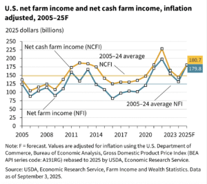 “Net cash farm income, a measure of producers’ cash flow, is forecast at $180.7 billion for 2025, an increase of $36.5 billion, or 25.3%, over last year when adjusted for inflation, according to the forecast issued by the Economic Research Service on Wednesday,” Brasher reported. “In February, USDA had forecast net cash farm income for 2025 at $193.7 billion.”