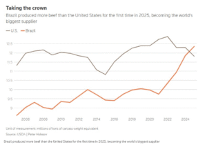 “Brazil was already the biggest beef exporter, shipping meat worth almost $17 billion in 2025, according to government trade data released (last week),” Mano and Hobson reported. “Beef production numbers are not due until February, but analysts have recently raised their estimates. Farmers have been sending more animals to slaughter, cashing in on high export demand from countries including China and the U.S., where low supply has pushed beef prices to record levels.”