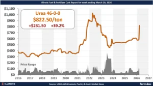 AgWeb’s Michelle Rook reported that “the conflict in the Middle East is having a negative impact on input costs. farmdoc daily recently reported significant price increases for various inputs, ranging from sulfate and DAP to diesel. These rising costs are further stressing profit margins that were already tight or even negative. Unfortunately, the recent improvement in corn prices is not enough to offset the increases.”