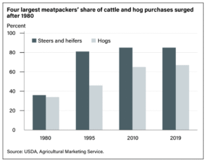 “The meatpacking industry has long faced bipartisan scrutiny due to high levels of concentration. The country’s top four beef packers buy more than 80% of cattle, while a separate group of pork processors account for about two-thirds of hog purchases, according to the US Department of Agriculture,” Peng and Nylen reported. “Those levels of concentration are higher than when the US first took action against the meatpacking industry in the 1920s, Schumer noted.”