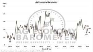 March 2026 Purdue University-CME Group Ag Economy Barometer (AEB) Index. Courtesy of Purdue.