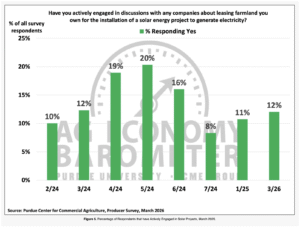 Purdue’s Morgan French reported that “the March survey also included questions about leasing farmland for solar energy production. Twelve percent of producers reported discussing a solar lease within the past six months. Reported lease rates varied widely, with roughly 21% exceeding $1,500 per acre. More than half of respondents (56%) said contract offers included an escalator clause, most commonly in the 2% to 3% annual range. Overall, 5% of respondents indicated that they or one of their landowners had signed a solar lease. ”