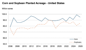“The same report showed estimated soybean plantings at a lighter than expected 84.7 million acres, up 4.3% from 2025’s six-year low but about 849,000 acres short of the average estimate,” Blythe reported. “USDA’s acreage estimates suggest many farmers see greater profit potential in corn compared to soybeans and other crops even after last year’s record 17.02 billion-bushel harvest swelled supplies to multi-year highs. This year’s expected planted acreage would be the fourth highest since the end of World War II and could generate a near-record harvest if weather cooperates.”